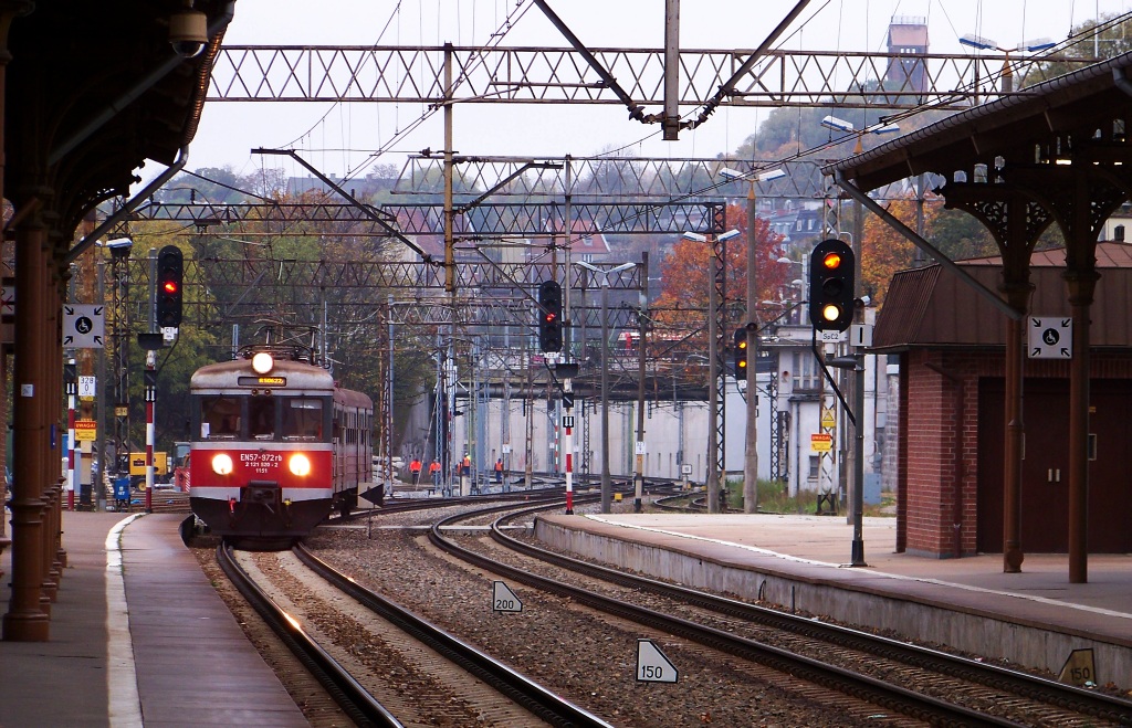 2014-10-23, czwartek Jednostka EN57-972, bodajże o zielonych siedzeniach ładnie, planowo melduje się w peronie Gdańska Głównego i za kilka minut uda się zakończyć trasę w Gdyni. Po prawej świeci się już semafor dla zmodernizowanej jednostki EN57AKM-880 SKM, która zaraz wyruszy do Tczewa.