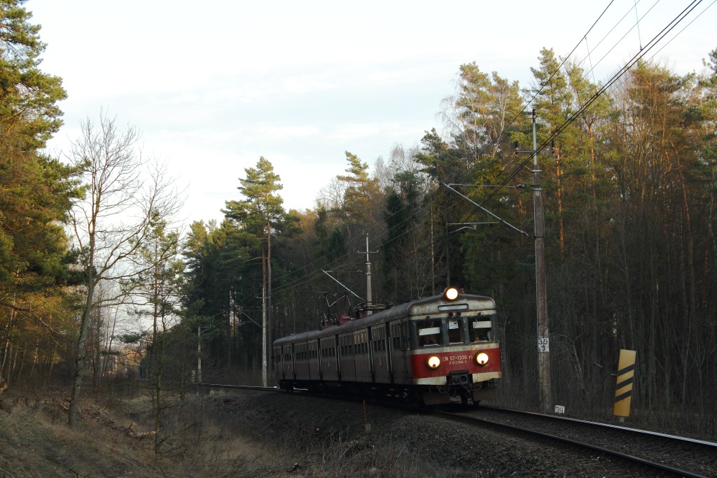 EN57-1336 mija oczyszczony z krzaków łuk za Żabim Rogiem w drodze do Elbląga.