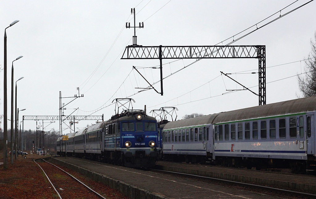 EP07-400 przechodzi śpiesznie między peronami Żabiego Rogu z TLK Gryf do Olsztyna. Obok Gryf do Szczecina czeka na dopełnienie się mijanki. Warunki jakieś trudne były, do tego deszczyk, ale niech już będzie ;)