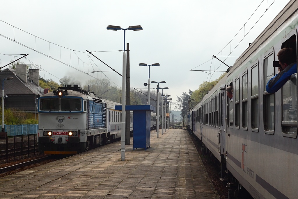 Nurek 754 037-0 wraz z TLK Mamry do Wrocławia wpada właśnie w fotograficzny ogień krzyżowy. Na zdjęciu Marek robi swoje zdjęcie z okna TLK Polaris do Białegostoku, a ja załapałem się na filmiku Damiana - pozdrawiam kolegów :)