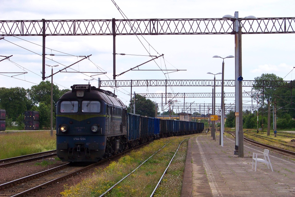 ST44-1234 stoi sobie ze składem pełnych polskiego drewna z Braniewa węglarek w Morągu.