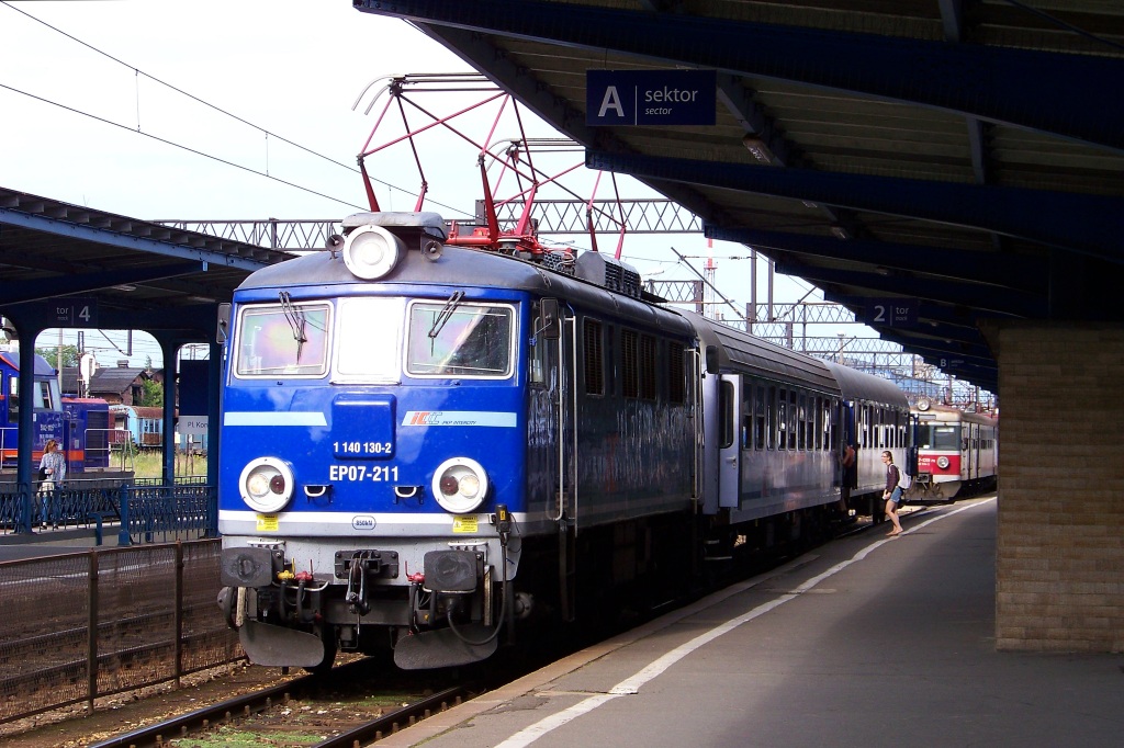 2016-06-29, środa I w końcu jest! Odratowana EP07-211 na czele lekkiego pociągu TLK Drwęca do Poznania. Powalająca siłą dwóch wagonów dała się we znaki widocznym duszom, które upakowały rower do przedziału, bo była kartka, że przedział dla rowerów. I taka informacja, że w systemie ten pociąg nie ma 1. klasy.