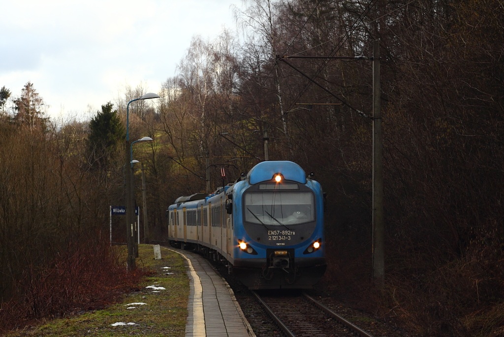 EN57-892 wtacza się w przekatowany przystanek Milówka Zabawa, żeby mnie zabrać na codzienną pielgrzymkę na zimne Maledivy.