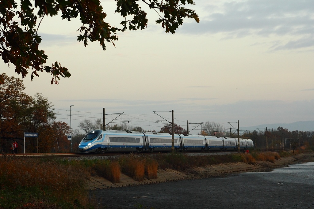 Dzień nieubłaganie i szybko kończy się, a niezidentyfikowane Pendolino przechodzi przez Goczałkowice Zdrój w drodze z Bielska do Gdyni na tle mułu , który został po stawie.