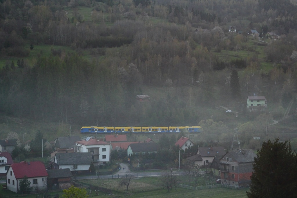 Drugie ujęcie wieczornego Flirta EN75 z Katowic do Zwardonia, który tym razem przebija się przez górski smok w Rajczy.
