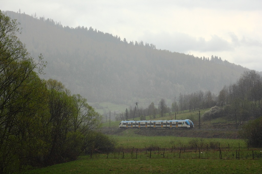 Deszczyk się wzmógł, że aż widoczność pogorszyło. Elf EN76-00? (w demencji nie zapisałem...) dociera po oczyszczonym nasypie do przystanku Milówka Zabawa w drodze z Zwardonia do Katowic.