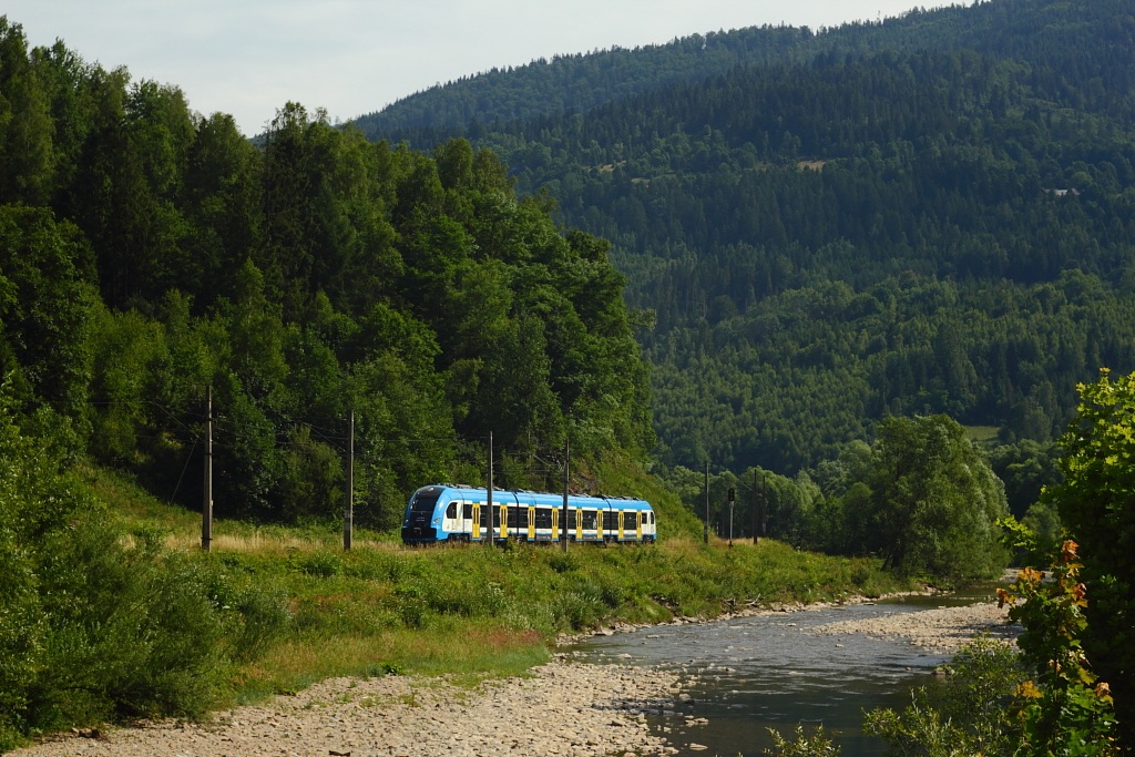 2019-07-05, piątek Kadr, na który się już od dłuższego czasu zamierzałem w związku z krzakorżnięciem kapitalnym, bo wcześniej to miejsce za wysokimi krzaczorami było. Na zdjęciu Elf 2 22WEd-0096 przeciska się przez łuki wzdłuż Soły przed dobudowanym przystankiem Rajcza Centrum.