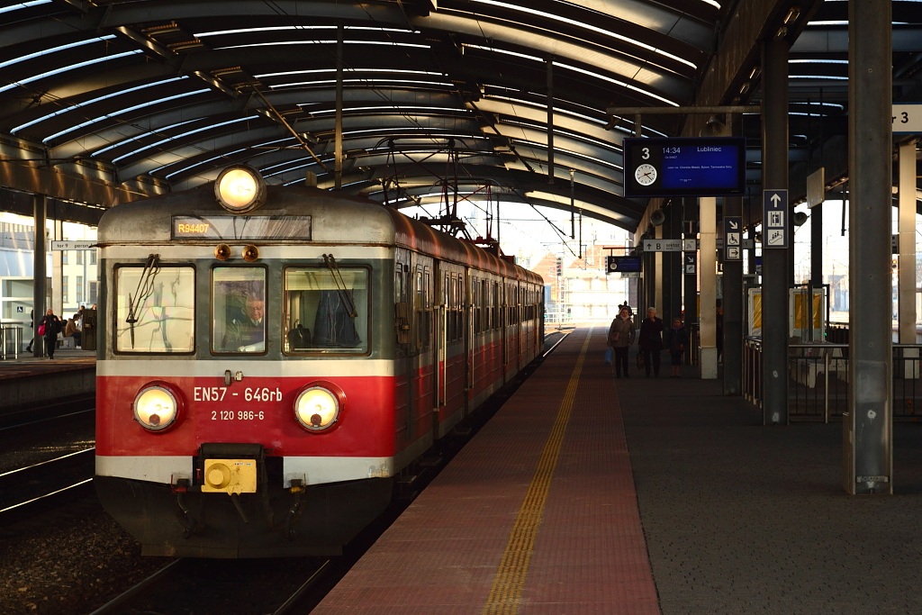 Uchowany w miarę klasyczny kurnik EN57-646 czeka odjazdu do Lublińca. Na takiej trasie jednostka jak najbardziej wskazana, bo na części trasy między Chorzowem a Bytomiem bicie niemiłosierne jest.