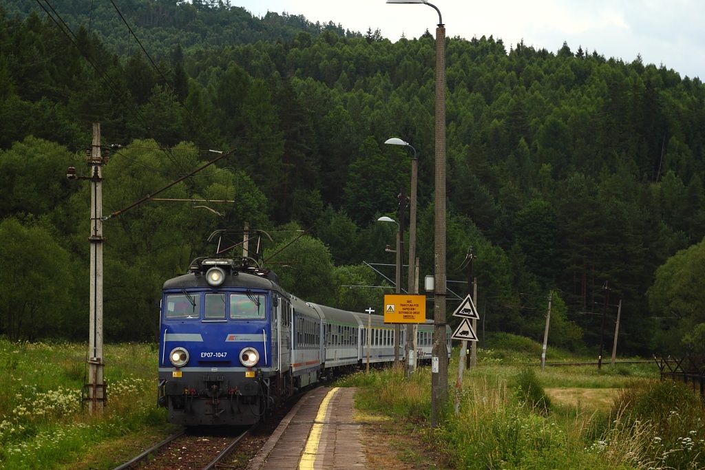 2021-07-11, niedziela EP07-1047 wchodzi w peron Rycerki z opóźnionym o 1h TLK Rozewie do Zwardonia. W weekend występuje niuans, że Rozewie planowo 10 minut wcześniej idzie, a sypialka wędruje jako pierwszy wagon. W tyle widać krzywe słupy, które osunęły się ze skromnym nasypem.