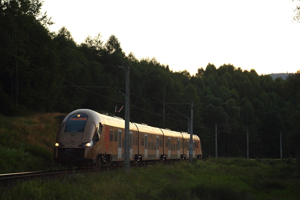 Wieczorny wyjazd na Elfy. Na zdjęciu złoty Elf EN76-009 przeciska się po łuku za stacją w Soli jako ostatnie tego dnia połączenie z Zwardonia do Katowic. Drugi Elf dotkliwie się spóźnił i uniknął kontaktu z aparatem autora.
