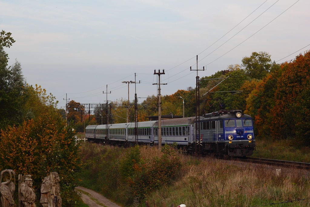 2021-10-06, środa Autor podgonił dziś po porannej niewoli i zdążył na TLK Biebrza do Warszawy w jesiennej scenerii. Na zdjęciu EP07-391 rozpędza się z zestawieniem po odstaniu mijanki z osobowym Olsztyn - Malbork. Fota na oparach baterii (na Stańczyka już nie starczyło) a w dodatku karta SD w czytniku została i trzeba było szybko z telefonu przekładać.