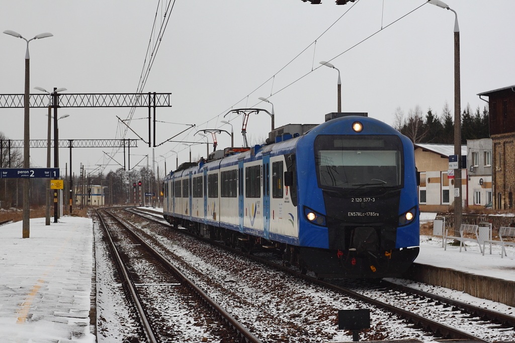 2022-01-17, poniedziałek 12 Milionów EN57ALc-1785 czeka w Małdytach na pasażerów i na rozpoczęcie kursu do Olsztyna. Kurs do Elbląga został zakończony w Małdytach zapewne przez jakąmś niedrożność szlaku spowodowaną porannymi wichurami. Pasażerowie pojechali dalej komunikacją zastępczą.