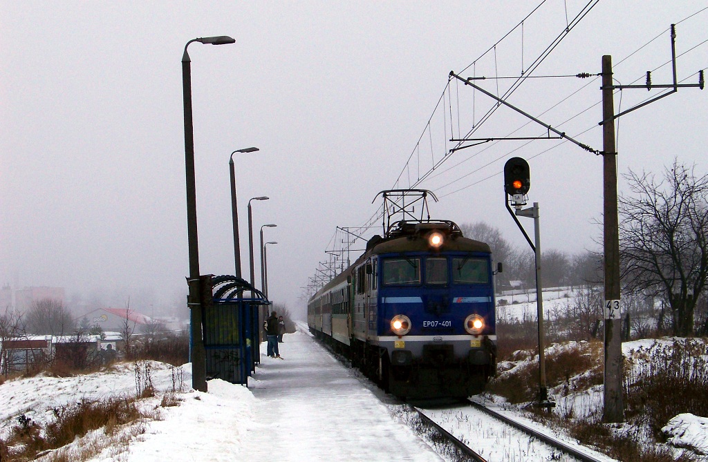 2012-12-24, poniedziałek EP07-401 z jednominutowym opóźnieniem przejeżdża obok peronu Morąga Koloni prowadząc TLK Gryf do Olsztyna. Na peronie widać podróżnych czekających na osobówkę do Elbląga (EN57-947). "Prawdą jest",że bez programu graficznego GIMP nic by z tego zdjęcia nie było.