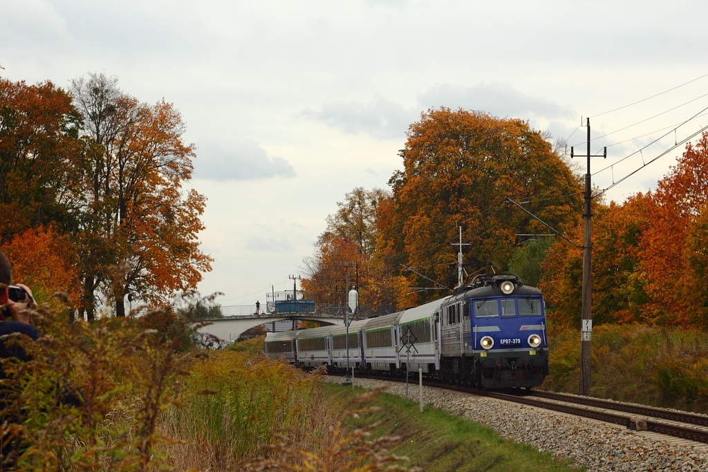 2022-10-08, sobota Chyba najlepsza jesienna miejscówka na Gutkowie i ciągle nie zarasta po czystkach przy modernie. EP07-379 dochodzi z IC Gryf do Szczecina do wjazdowego do Gutkowa. Z lewej działą Marek ubogacając kadr, a na wiadukcie małoletni obserwuje fotografów przez konkretną lornetkę.