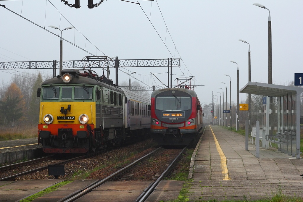 Przypadkowe trafienie w żółte czoło EP07-442 z TLK Biebrza do Warszawy na przejściu przez Małdyty. Obok odczekuje pociąg niższy kategorią czyli Olsztyn-Malbork w postaci EN57-2052.