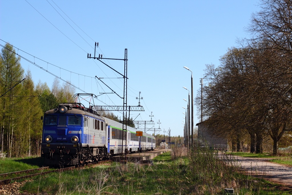 2023-04-22, sobota EP07-388 przechodzi przez stację w Żabim Rogi z IC Gryf do Szczecina. W tle pręży się już uzbrojony obelisk GSM. Szczegóły