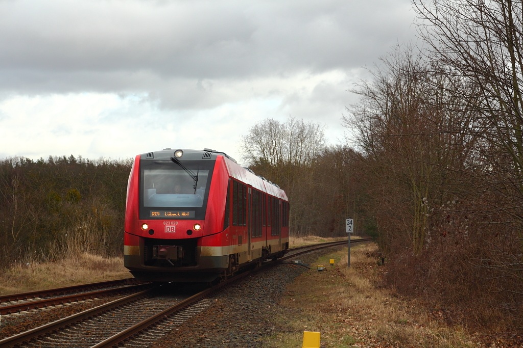 2024-02-03, sobota Autor zalicza kolejny wypad do Niemiec. Pierwszy zaplanowany szynobus przepadł, bo jazda bicyklem pod silny wiatr ciągnęła się zbyt długo. Na zdjęciu BR623 028 w relacji Szczecin - Lübeck Hbf wchodzi na stację w Löcknitz i zaraz minie nieczynną, dobrze zabezpieczoną nastawnię, która ciągle jeszcze jest w dobrej kondycji.