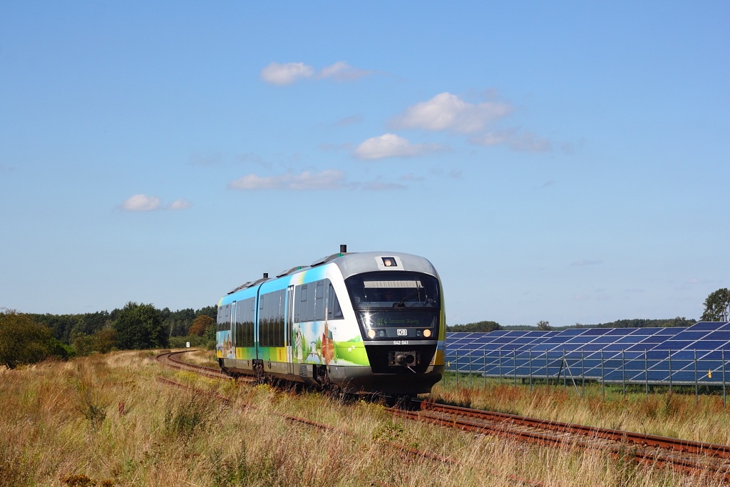 2024-08-24, sobota Oklejony BR 642 041 dochodzi do Löcknitz jako RB z Lübeck do Szczecina mijając fermę słoneczną. Tym zdjęciem się kończy seria z Niemiec na ten rok. Za 8 dni zostanie zerwane połączenie kolejowe Szczecina z Trójmiastem.