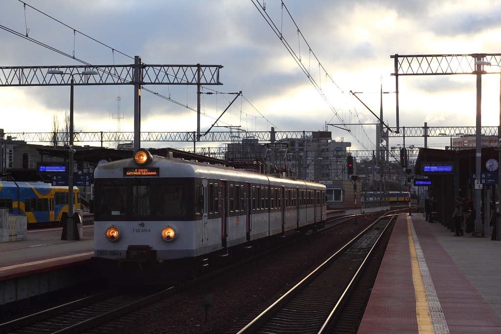 EN57-1184 zakończył swój bogaty w przystanki bieg z Malborka w Gdyni. Autor w oczekiwaniu na IC Stańczyk próbuje coś sensownie sfocić, ale niebo się pod słońce wypaliło.