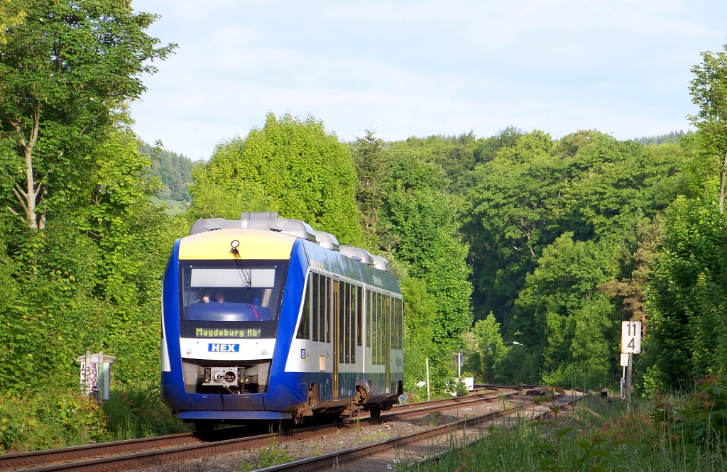 2013-06-05, środa Miała być wiedźmowata Ola, a tu pojechała zwyka BR 648, której taborowego numeru nie sposób ustalić. Tak prezentuje się ranny pociąg relacji Goslar-Magdeburg (Gosia-Magda). Jest to jedyny pociąg na dobę, który uruchamia HEX (HarzElbeExpress) i jedyny bezpośredni do Magdeburga. W tej chwili szynobusik jest niedaleko za stacją początkową.