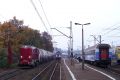 2013-10-10, czwartek Większe spotkanie na stacji we Wrzeszczu. Od lewej: lokomotywa T448p-048, która już tu stoi od dłuższego czasu, EP09-006 z TLK Neptun relacji Gdynia - Warszawa Wschodnia, który też spędził tu niekrótką chwilę. Po drugiej stronie peronu zbiera się do odjazdu do Gdyni przez Sopot zbiorowe TLK Doker+Heweliusz. Całkiem z prawej ucieka z kadru SKM-ka do Gdańska.
