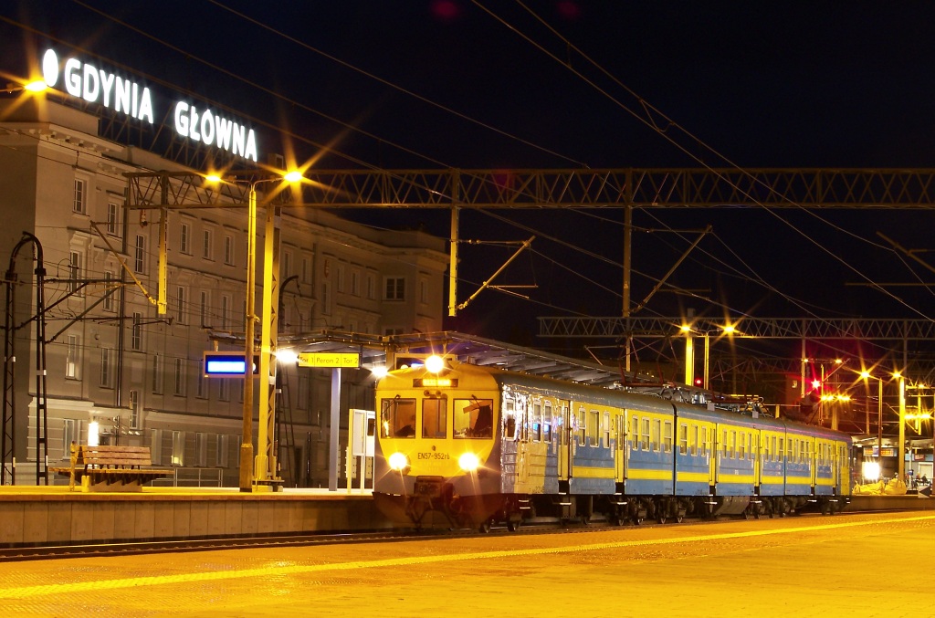 2013-11-11, poniedziałek Jedyna niezmodernizowana, a pomalowana w barwy AL jednostka EN57-952 czeka na odjazd jako pociąg osobowy do Helu, a na wyświetlaczu do Redy. Warto wspomnieć, że ta jednostka spędziła pewnien okres czasu w olsztyńskim Zakładzie PR. W dniu, kiedy "ją" poznałem została ukończona naprawa i uzyskała obecne malowanie.